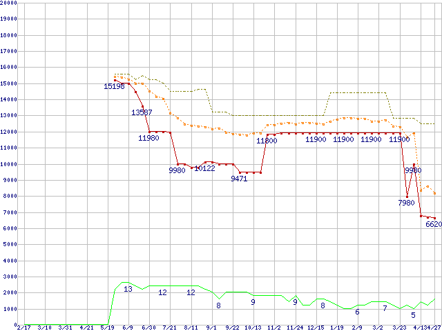 ※このグラフは過去のデータも税率5%相当に調整した税込み相当額のグラフです。 税率変更や、総額表示方式導入(2004年4月)の影響は除いています。 | | | ●凡例 | 最安値 (点線部は販売店未確認 または未調査) | 平均値 | 最高値 | ショップ数 |