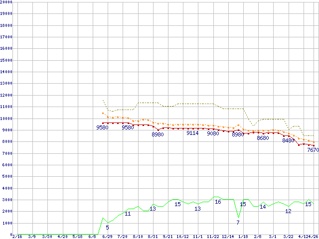 ※このグラフは過去のデータも税率5%相当に調整した税込み相当額のグラフです。 税率変更や、総額表示方式導入(2004年4月)の影響は除いています。 | | | ●凡例 | 最安値 (点線部は販売店未確認 または未調査) | 平均値 | 最高値 | ショップ数 |