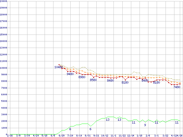 ※このグラフは過去のデータも税率5%相当に調整した税込み相当額のグラフです。 税率変更や、総額表示方式導入(2004年4月)の影響は除いています。 | | | ●凡例 | 最安値 (点線部は販売店未確認 または未調査) | 平均値 | 最高値 | ショップ数 |