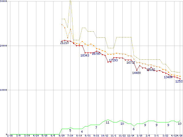 ※このグラフは過去のデータも税率5%相当に調整した税込み相当額のグラフです。 税率変更や、総額表示方式導入(2004年4月)の影響は除いています。 | | | ●凡例 | 最安値 (点線部は販売店未確認 または未調査) | 平均値 | 最高値 | ショップ数 |