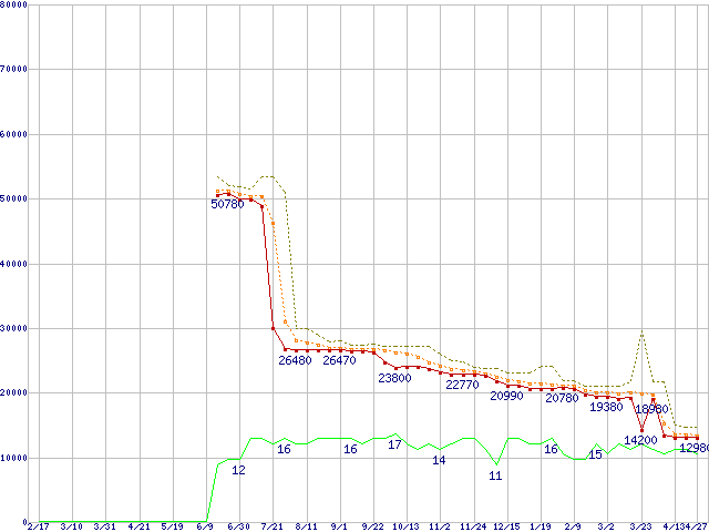※このグラフは過去のデータも税率5%相当に調整した税込み相当額のグラフです。 税率変更や、総額表示方式導入(2004年4月)の影響は除いています。 | | | ●凡例 | 最安値 (点線部は販売店未確認 または未調査) | 平均値 | 最高値 | ショップ数 |