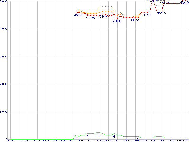 ※このグラフは過去のデータも税率5%相当に調整した税込み相当額のグラフです。 税率変更や、総額表示方式導入(2004年4月)の影響は除いています。 | | | ●凡例 | 最安値 (点線部は販売店未確認 または未調査) | 平均値 | 最高値 | ショップ数 |