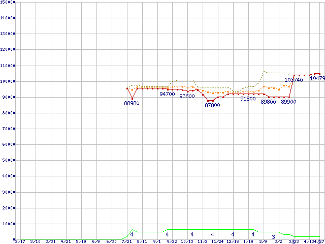 ※このグラフは過去のデータも税率5%相当に調整した税込み相当額のグラフです。 税率変更や、総額表示方式導入(2004年4月)の影響は除いています。 | | | ●凡例 | 最安値 (点線部は販売店未確認 または未調査) | 平均値 | 最高値 | ショップ数 |