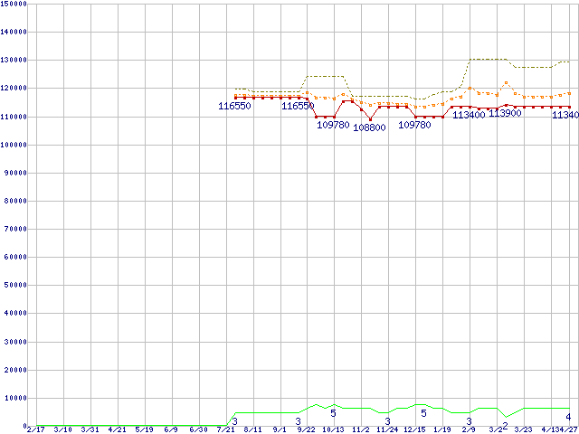 ※このグラフは過去のデータも税率5%相当に調整した税込み相当額のグラフです。 税率変更や、総額表示方式導入(2004年4月)の影響は除いています。 | | | ●凡例 | 最安値 (点線部は販売店未確認 または未調査) | 平均値 | 最高値 | ショップ数 |