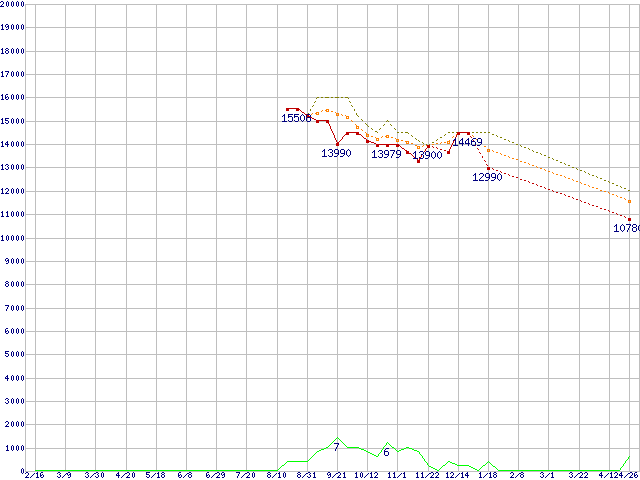 ※このグラフは過去のデータも税率5%相当に調整した税込み相当額のグラフです。 税率変更や、総額表示方式導入(2004年4月)の影響は除いています。 | | | ●凡例 | 最安値 (点線部は販売店未確認 または未調査) | 平均値 | 最高値 | ショップ数 |