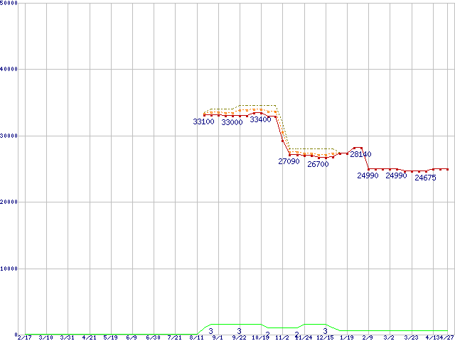 ※このグラフは過去のデータも税率5%相当に調整した税込み相当額のグラフです。 税率変更や、総額表示方式導入(2004年4月)の影響は除いています。 | | | ●凡例 | 最安値 (点線部は販売店未確認 または未調査) | 平均値 | 最高値 | ショップ数 |