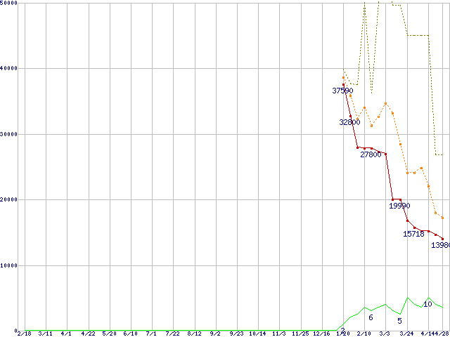※このグラフは過去のデータも税率5%相当に調整した税込み相当額のグラフです。 税率変更や、総額表示方式導入(2004年4月)の影響は除いています。 | | | ●凡例 | 最安値 (点線部は販売店未確認 または未調査) | 平均値 | 最高値 | ショップ数 |