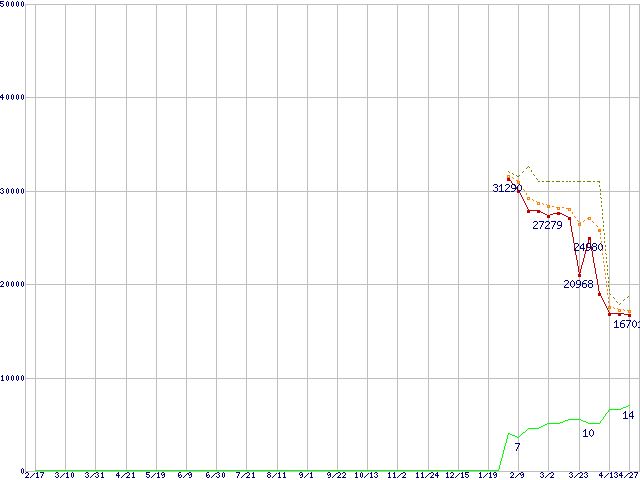 | Athlon 64 X2 4800+ (2.5GHz,L2 512KB×2,TDP65W)の価格推移 | | | (2006年2月17日~2007年4月27日) |