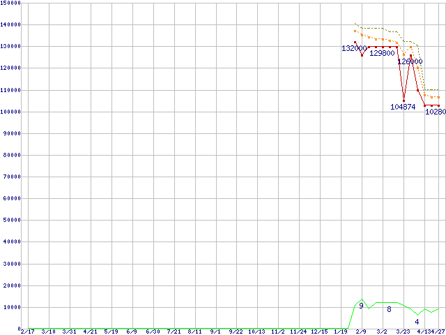 ※このグラフは過去のデータも税率5%相当に調整した税込み相当額のグラフです。 税率変更や、総額表示方式導入(2004年4月)の影響は除いています。 | | | ●凡例 | 最安値 (点線部は販売店未確認 または未調査) | 平均値 | 最高値 | ショップ数 |