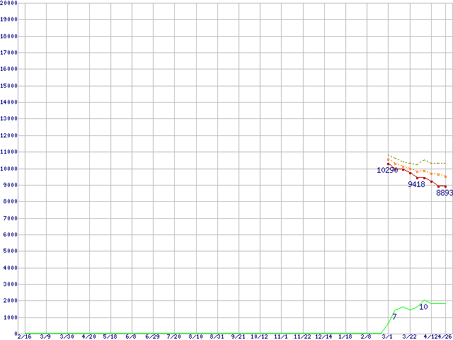 ※このグラフは過去のデータも税率5%相当に調整した税込み相当額のグラフです。 税率変更や、総額表示方式導入(2004年4月)の影響は除いています。 | | | ●凡例 | 最安値 (点線部は販売店未確認 または未調査) | 平均値 | 最高値 | ショップ数 |