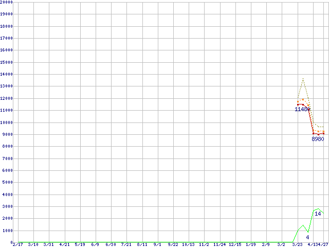 ※このグラフは過去のデータも税率5%相当に調整した税込み相当額のグラフです。 税率変更や、総額表示方式導入(2004年4月)の影響は除いています。 | | | ●凡例 | 最安値 (点線部は販売店未確認 または未調査) | 平均値 | 最高値 | ショップ数 |