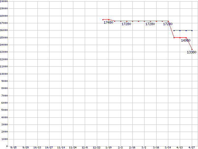 | Core Duo向けSocket 478 (FSB 533MHz,L2 1MB,EM64T対応)の最安値推移 | | | (2006年9月15日~2007年4月27日) |