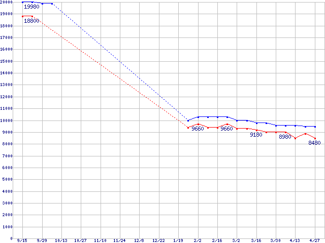 | LGA775 (FSB 800MHz,L2 2MB,Hyper-Threading,EM64T対応)の最安値推移 | | | (2006年9月15日~2007年4月27日) |
