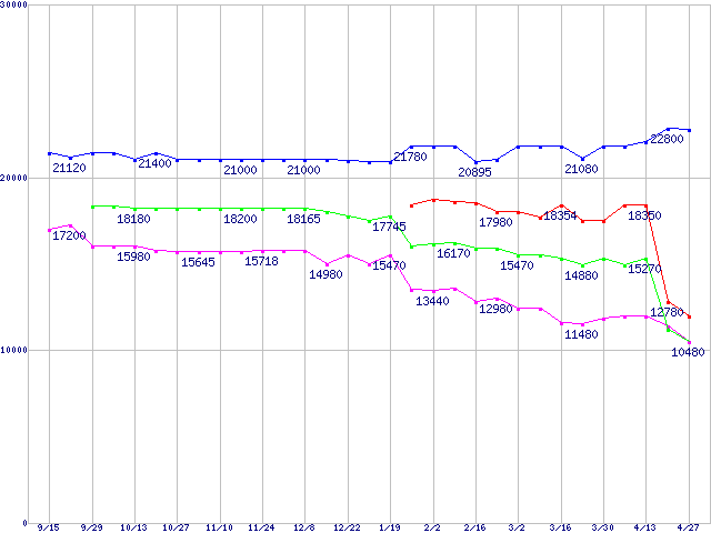 | LGA775 (FSB 800MHz,L2 2MB×2,Dual Core,EM64T対応)の最安値推移 | | | (2006年9月15日~2007年4月27日) |