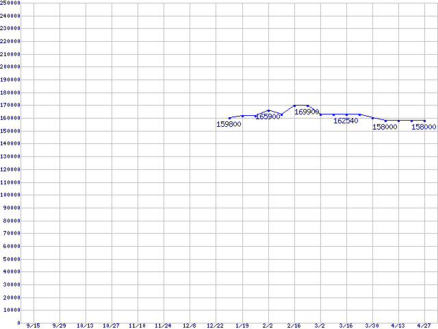 | LGA771(FSB 1333MHz,Quad Core,L2 4MB×2,TDP 120W)の最安値推移 | | | (2006年9月15日~2007年4月27日) |