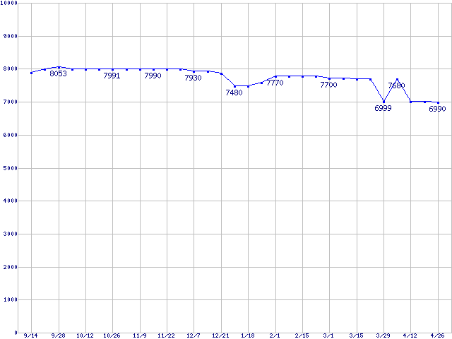 | WD Caviar[Special Edition] (7200rpm,Ultra ATA/100,8MB)の最安値推移 | | | (2006年9月14日~2007年4月26日) |