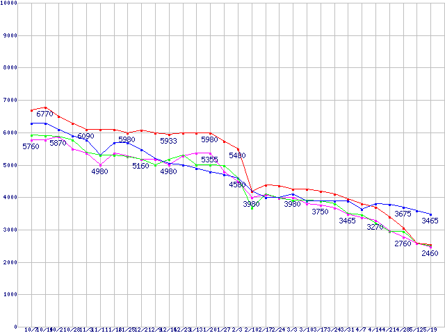 メモリ主要製品(最安値5千円未満)の最安値推移