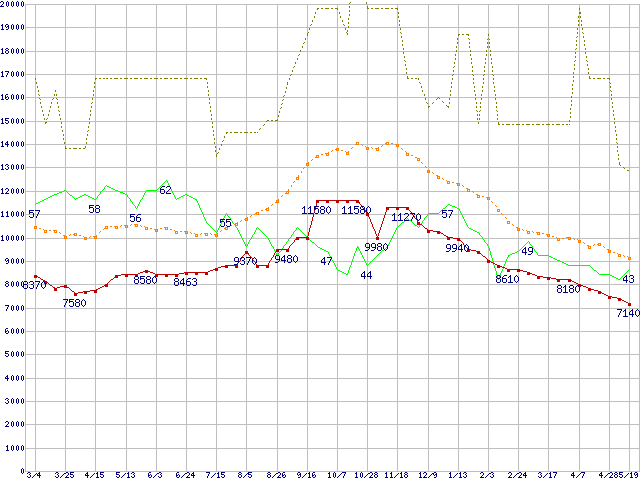 ※このグラフは過去のデータも税率5%相当に調整した税込み相当額のグラフです。 税率変更や、総額表示方式導入(2004年4月)の影響は除いています。 | | | ●凡例 | 最安値 (点線部は販売店未確認 または未調査) | 平均値 | 最高値 | ショップ数 |