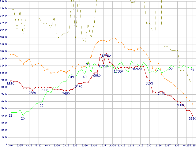 ※このグラフは過去のデータも税率5%相当に調整した税込み相当額のグラフです。 税率変更や、総額表示方式導入(2004年4月)の影響は除いています。 | | | ●凡例 | 最安値 (点線部は販売店未確認 または未調査) | 平均値 | 最高値 | ショップ数 |
