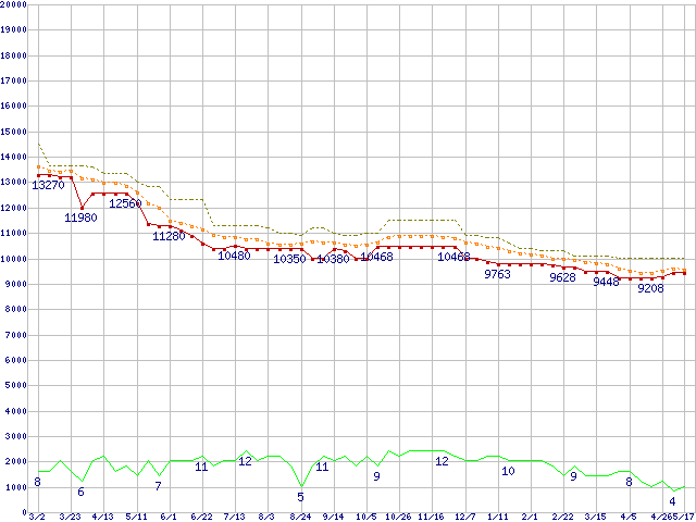 ※このグラフは過去のデータも税率5%相当に調整した税込み相当額のグラフです。 税率変更や、総額表示方式導入(2004年4月)の影響は除いています。 | | | ●凡例 | 最安値 (点線部は販売店未確認 または未調査) | 平均値 | 最高値 | ショップ数 |