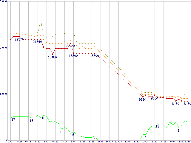 ※このグラフは過去のデータも税率5%相当に調整した税込み相当額のグラフです。 税率変更や、総額表示方式導入(2004年4月)の影響は除いています。 | | | ●凡例 | 最安値 (点線部は販売店未確認 または未調査) | 平均値 | 最高値 | ショップ数 |
