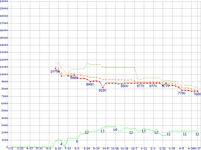 ※このグラフは過去のデータも税率5%相当に調整した税込み相当額のグラフです。 税率変更や、総額表示方式導入(2004年4月)の影響は除いています。 | | | ●凡例 | 最安値 (点線部は販売店未確認 または未調査) | 平均値 | 最高値 | ショップ数 |