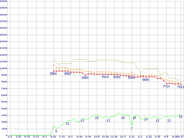 ※このグラフは過去のデータも税率5%相当に調整した税込み相当額のグラフです。 税率変更や、総額表示方式導入(2004年4月)の影響は除いています。 | | | ●凡例 | 最安値 (点線部は販売店未確認 または未調査) | 平均値 | 最高値 | ショップ数 |