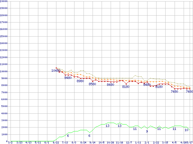 ※このグラフは過去のデータも税率5%相当に調整した税込み相当額のグラフです。 税率変更や、総額表示方式導入(2004年4月)の影響は除いています。 | | | ●凡例 | 最安値 (点線部は販売店未確認 または未調査) | 平均値 | 最高値 | ショップ数 |