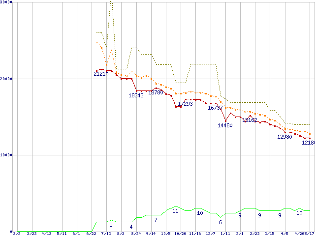 ※このグラフは過去のデータも税率5%相当に調整した税込み相当額のグラフです。 税率変更や、総額表示方式導入(2004年4月)の影響は除いています。 | | | ●凡例 | 最安値 (点線部は販売店未確認 または未調査) | 平均値 | 最高値 | ショップ数 |