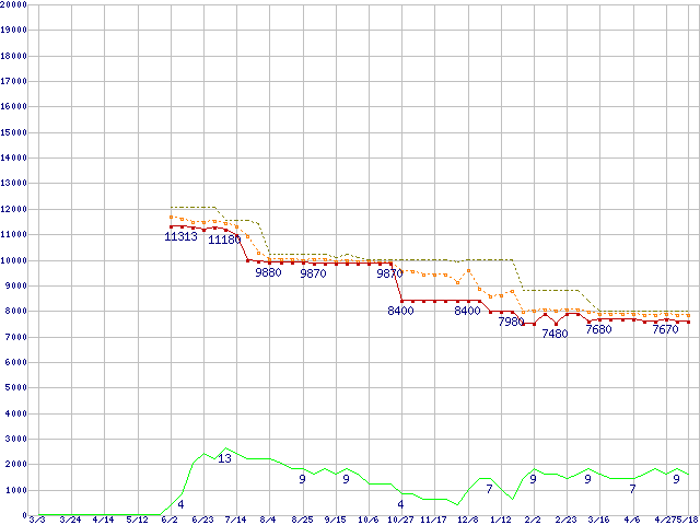 ※このグラフは過去のデータも税率5%相当に調整した税込み相当額のグラフです。 税率変更や、総額表示方式導入(2004年4月)の影響は除いています。 | | | ●凡例 | 最安値 (点線部は販売店未確認 または未調査) | 平均値 | 最高値 | ショップ数 |