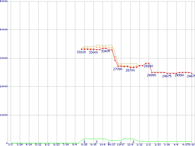 ※このグラフは過去のデータも税率5%相当に調整した税込み相当額のグラフです。 税率変更や、総額表示方式導入(2004年4月)の影響は除いています。 | | | ●凡例 | 最安値 (点線部は販売店未確認 または未調査) | 平均値 | 最高値 | ショップ数 |