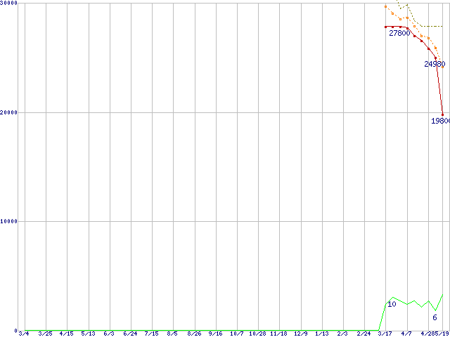 ※このグラフは過去のデータも税率5%相当に調整した税込み相当額のグラフです。 税率変更や、総額表示方式導入(2004年4月)の影響は除いています。 | | | ●凡例 | 最安値 (点線部は販売店未確認 または未調査) | 平均値 | 最高値 | ショップ数 |