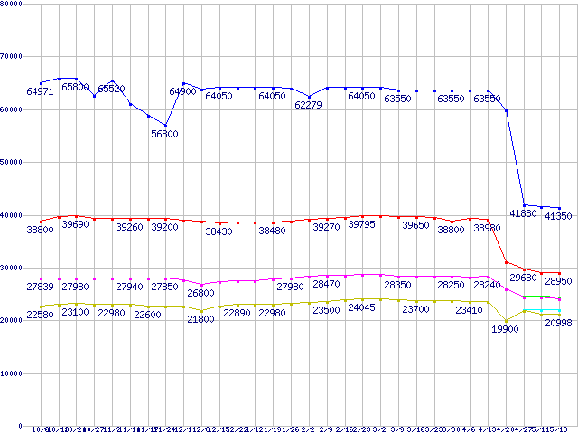 | LGA775 (FSB 1066MHz,Dual Core,EM64T対応,TDP 65W)の最安値推移 | | | (2006年10月6日~2007年5月18日) |