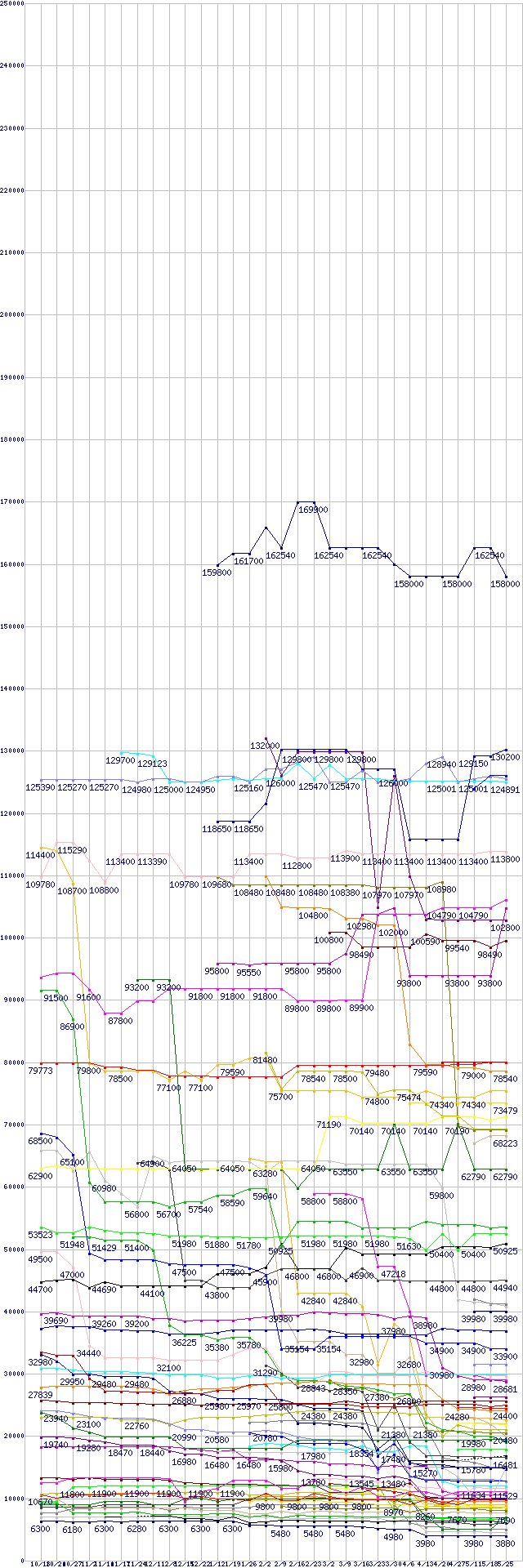 | 凡例 | Xeon X5355(2.66GHz) | Xeon E5345(2.33GHz) | Opteron 2222SE (3.0GHz) バルク | Core 2 Extreme X6800 (2.93GHz) | Core 2 Extreme QX6700 (2.66GHz) | Xeon 5160(3GHz) | Xeon 5150(2.66GHz) | Xeon E5335(2.00GHz) | Athlon 64 FX-74 (3.0GHz) ※2個セットの価格 | Opteron 2220 (2.8GHz) | Opteron 2218 HE (2.6GHz) | Core 2 Duo T7600 (2.33GHz,L2 4MB) | Athlon 64 FX-72 (2.8GHz) ※2個セットの価格 | Opteron 2218 (2.6GHz) | Xeon L5320(1.86GHz) | Xeon 5140(2.33GHz) | Athlon 64 FX-70 (2.6GHz) ※2個セットの価格 | Core 2 Quad Q6600 (2.40GHz,L2 4MB×2) | Core 2 Duo T7700 (2.4GHz,L2 4MB) | Xeon E5320(1.86GHz) | Opteron 2216 (2.4GHz) | Core 2 Duo T7400 (2.16GHz,L2 4MB) | Xeon 5130(2GHz) | Xeon E5310(1.60GHz) | Core 2 Duo T7500 (2.2GHz,L2 4MB) | Core 2 Duo E6700 (2.66GHz,L2 4MB) | Turion 64 X2 TL-64 (2.2GHz,512KB×2) | Core 2 Duo T7200 (2.00GHz,L2 4MB) | Opteron 2214 (2.2GHz) | Core 2 Duo T7300 (2.0GHz,L2 4MB) | Core 2 Duo T5600 (1.83GHz,L2 2MB) | Opteron 2212 (2.0GHz) | Athlon 64 X2 6000+ (3.0GHz,L2 1MB×2) | Core 2 Duo E6600 (2.40GHz,L2 4MB) | Core 2 Duo T7100 (1.8GHz,L2 2MB) | Core 2 Duo T5500 (1.66GHz,L2 2MB) | Opteron 2210 (1.8GHz) | Core 2 Duo E6420 (2.13GHz,L2 4MB) | Core 2 Duo E6400 (2.13GHz,L2 2MB) | Athlon 64 X2 5600+ (2.8GHz,L2 1MB×2) | Athlon 64 X2 5200+ (2.6GHz,L2 1MB×2,TDP65W) | Core 2 Duo E6320 (1.86GHz,L2 4MB) | Core 2 Duo E6300 (1.86GHz,L2 2MB) | Athlon 64 X2 5000+ (2.6GHz,L2 512KB×2,TDP65W) | Athlon 64 X2 5400+ (2.8GHz,L2 512KB×2) | Turion 64 X2 TL-50 (1.6GHz,256KB×2) | Athlon 64 X2 5200+ (2.6GHz,L2 1MB×2) | Core 2 Duo E4400 (2GHz,L2 2MB) | Celeron M 530 (1.73GHz) | Athlon 64 X2 4800+ (2.5GHz,L2 512KB×2,TDP65W) | Core 2 Duo E4300 (1.80GHz,L2 2MB) | Celeron M 520 (1.60GHz) | Athlon 64 X2 4400+ (2.3GHz,L2 512KB×2,TDP65W) | Athlon 64 X2 4600+ (2.4GHz,L2 512KB×2,TDP65W) | Athlon 64 X2 4000+ (2.1GHz,L2 512KB×2,TDP65W) | Athlon 64 X2 4200+ (2.2GHz,L2 512KB×2,TDP65W) | Pentium D 935 (3.2GHz) | Athlon 64 4000+ (2.6GHz,L2 512KB) | Athlon 64 3800+ (2.4GHz,L2 512KB,Socket 939) | Pentium D 925 (3.0GHz) | Athlon 64 X2 3800+ (2.0GHz,L2 512KB×2,TDP65W) | Athlon 64 3800+ (2.4GHz,L2 512KB) | Athlon 64 3800+ (2.4GHz,L2 512KB,TDP 45W) | Athlon 64 3500+ (2.2GHz,L2 512KB,Socket 939) | Pentium 4 641 (3.20GHz) | Athlon 64 X2 3600+ (1.9GHz,L2 512KB×2,TDP65W) | Pentium 4 631 (3GHz) | Athlon 64 3500+ (2.2GHz,L2 512KB,TDP 45W) | Athlon 64 3500+ (2.2GHz,L2 512KB) | Celeron D 360 (3.46GHz) | Celeron D 356 (3.33GHz) | Athlon 64 3200+ (2.0GHz,L2 512KB) | Celeron D 352 (3.20GHz) | Sempron 3600+ (2.0GHz,L2 256KB) | Celeron D 347 (3.06GHz) | Sempron 3500+ (2.0GHz,L2 128KB) | Sempron 3400+ (1.8GHz,L2 256KB) | Sempron 3200+ (1.8GHz,L2 128KB) | Sempron 3000+ (1.6GHz,L2 256KB) | ※製品名をクリックすると個別のグラフを表示します ※点線部は販売店が確認できなかった、または調査データがないことを示します |