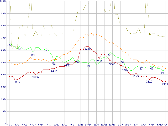 ※このグラフは過去のデータも税率5%相当に調整した税込み相当額のグラフです。 税率変更や、総額表示方式導入(2004年4月)の影響は除いています。 | | | ●凡例 | 最安値 (点線部は販売店未確認 または未調査) | 平均値 | 最高値 | ショップ数 |