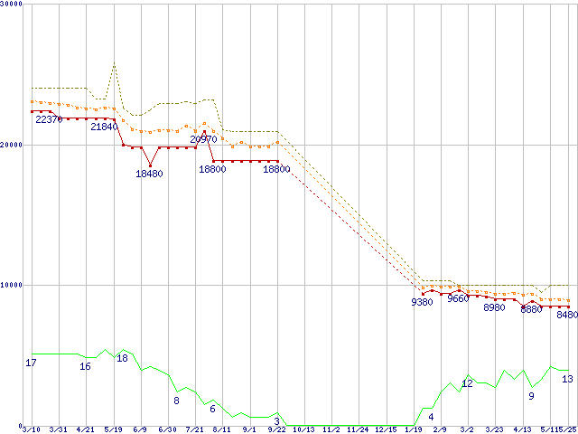 ※このグラフは過去のデータも税率5%相当に調整した税込み相当額のグラフです。 税率変更や、総額表示方式導入(2004年4月)の影響は除いています。 | | | ●凡例 | 最安値 (点線部は販売店未確認 または未調査) | 平均値 | 最高値 | ショップ数 |
