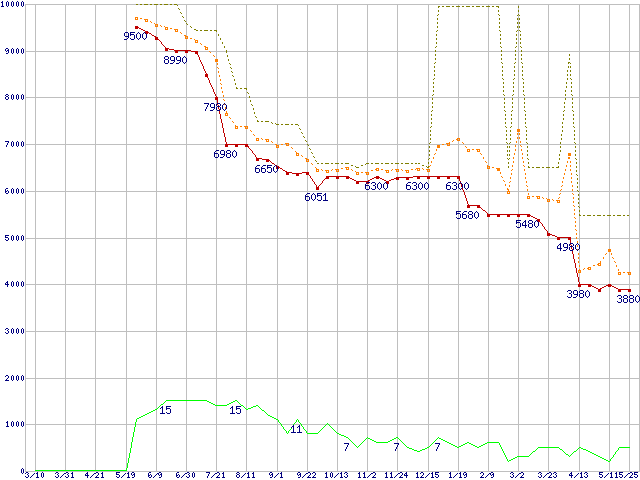 ※このグラフは過去のデータも税率5%相当に調整した税込み相当額のグラフです。 税率変更や、総額表示方式導入(2004年4月)の影響は除いています。 | | | ●凡例 | 最安値 (点線部は販売店未確認 または未調査) | 平均値 | 最高値 | ショップ数 |