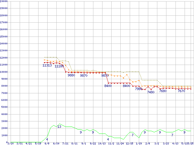 ※このグラフは過去のデータも税率5%相当に調整した税込み相当額のグラフです。 税率変更や、総額表示方式導入(2004年4月)の影響は除いています。 | | | ●凡例 | 最安値 (点線部は販売店未確認 または未調査) | 平均値 | 最高値 | ショップ数 |