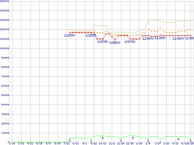 ※このグラフは過去のデータも税率5%相当に調整した税込み相当額のグラフです。 税率変更や、総額表示方式導入(2004年4月)の影響は除いています。 | | | ●凡例 | 最安値 (点線部は販売店未確認 または未調査) | 平均値 | 最高値 | ショップ数 |