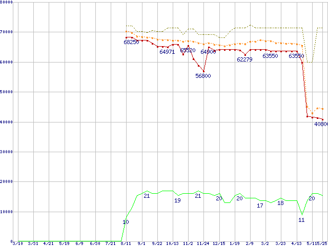| Core 2 Duo E6700 (2.66GHz,L2 4MB)の価格推移 | | | (2006年3月10日~2007年5月25日) |