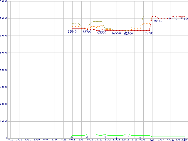 ※このグラフは過去のデータも税率5%相当に調整した税込み相当額のグラフです。 税率変更や、総額表示方式導入(2004年4月)の影響は除いています。 | | | ●凡例 | 最安値 (点線部は販売店未確認 または未調査) | 平均値 | 最高値 | ショップ数 |
