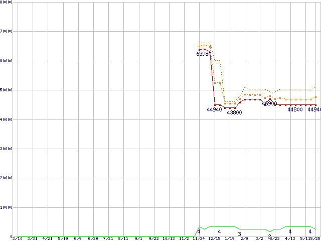 ※このグラフは過去のデータも税率5%相当に調整した税込み相当額のグラフです。 税率変更や、総額表示方式導入(2004年4月)の影響は除いています。 | | | ●凡例 | 最安値 (点線部は販売店未確認 または未調査) | 平均値 | 最高値 | ショップ数 |
