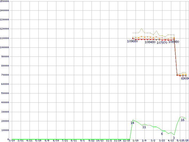 ※このグラフは過去のデータも税率5%相当に調整した税込み相当額のグラフです。 税率変更や、総額表示方式導入(2004年4月)の影響は除いています。 | | | ●凡例 | 最安値 (点線部は販売店未確認 または未調査) | 平均値 | 最高値 | ショップ数 |