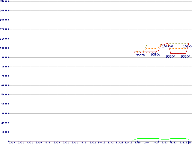 ※このグラフは過去のデータも税率5%相当に調整した税込み相当額のグラフです。 税率変更や、総額表示方式導入(2004年4月)の影響は除いています。 | | | ●凡例 | 最安値 (点線部は販売店未確認 または未調査) | 平均値 | 最高値 | ショップ数 |