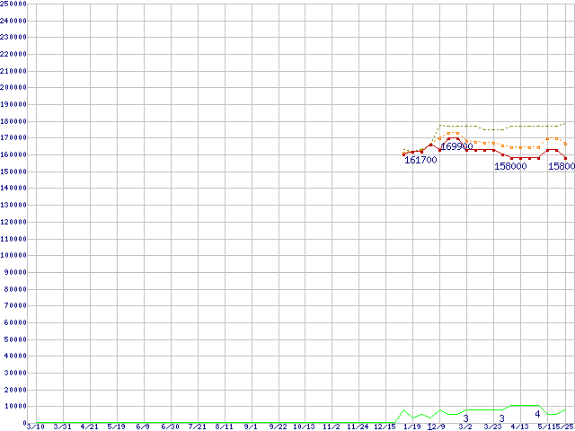 ※このグラフは過去のデータも税率5%相当に調整した税込み相当額のグラフです。 税率変更や、総額表示方式導入(2004年4月)の影響は除いています。 | | | ●凡例 | 最安値 (点線部は販売店未確認 または未調査) | 平均値 | 最高値 | ショップ数 |