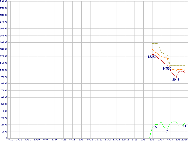 ※このグラフは過去のデータも税率5%相当に調整した税込み相当額のグラフです。 税率変更や、総額表示方式導入(2004年4月)の影響は除いています。 | | | ●凡例 | 最安値 (点線部は販売店未確認 または未調査) | 平均値 | 最高値 | ショップ数 |
