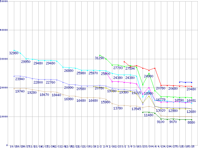 | 凡例 | Athlon 64 X2 5200+ (2.6GHz,L2 1MB×2,TDP65W) | Athlon 64 X2 5000+ (2.6GHz,L2 512KB×2,TDP65W) | Athlon 64 X2 4800+ (2.5GHz,L2 512KB×2,TDP65W) | Athlon 64 X2 4400+ (2.3GHz,L2 512KB×2,TDP65W) | Athlon 64 X2 4600+ (2.4GHz,L2 512KB×2,TDP65W) | Athlon 64 X2 4000+ (2.1GHz,L2 512KB×2,TDP65W) | Athlon 64 X2 4200+ (2.2GHz,L2 512KB×2,TDP65W) | Athlon 64 X2 3800+ (2.0GHz,L2 512KB×2,TDP65W) | Athlon 64 X2 3600+ (1.9GHz,L2 512KB×2,TDP65W) | ※製品名をクリックすると個別のグラフを表示します ※点線部は販売店が確認できなかった、または調査データがないことを示します |