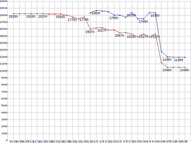 | LGA775 (FSB 800MHz,L2 2MB×2,Dual Core,EM64T対応)の最安値推移 | | | (2006年10月13日~2007年5月25日) |