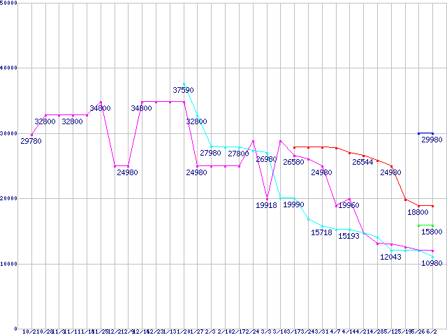 メモリ主要製品(最安値1万円以上)の最安値推移