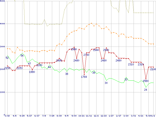 ※このグラフは過去のデータも税率5%相当に調整した税込み相当額のグラフです。 税率変更や、総額表示方式導入(2004年4月)の影響は除いています。 | | | ●凡例 | 最安値 (点線部は販売店未確認 または未調査) | 平均値 | 最高値 | ショップ数 |